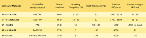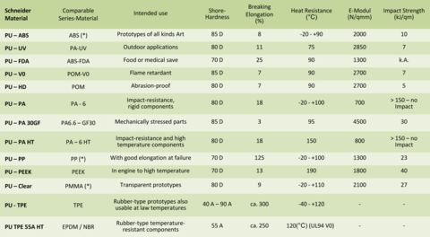 This table compares the standard PU resins we use with comparable production materials. We continually update this table because we are always testing new materials